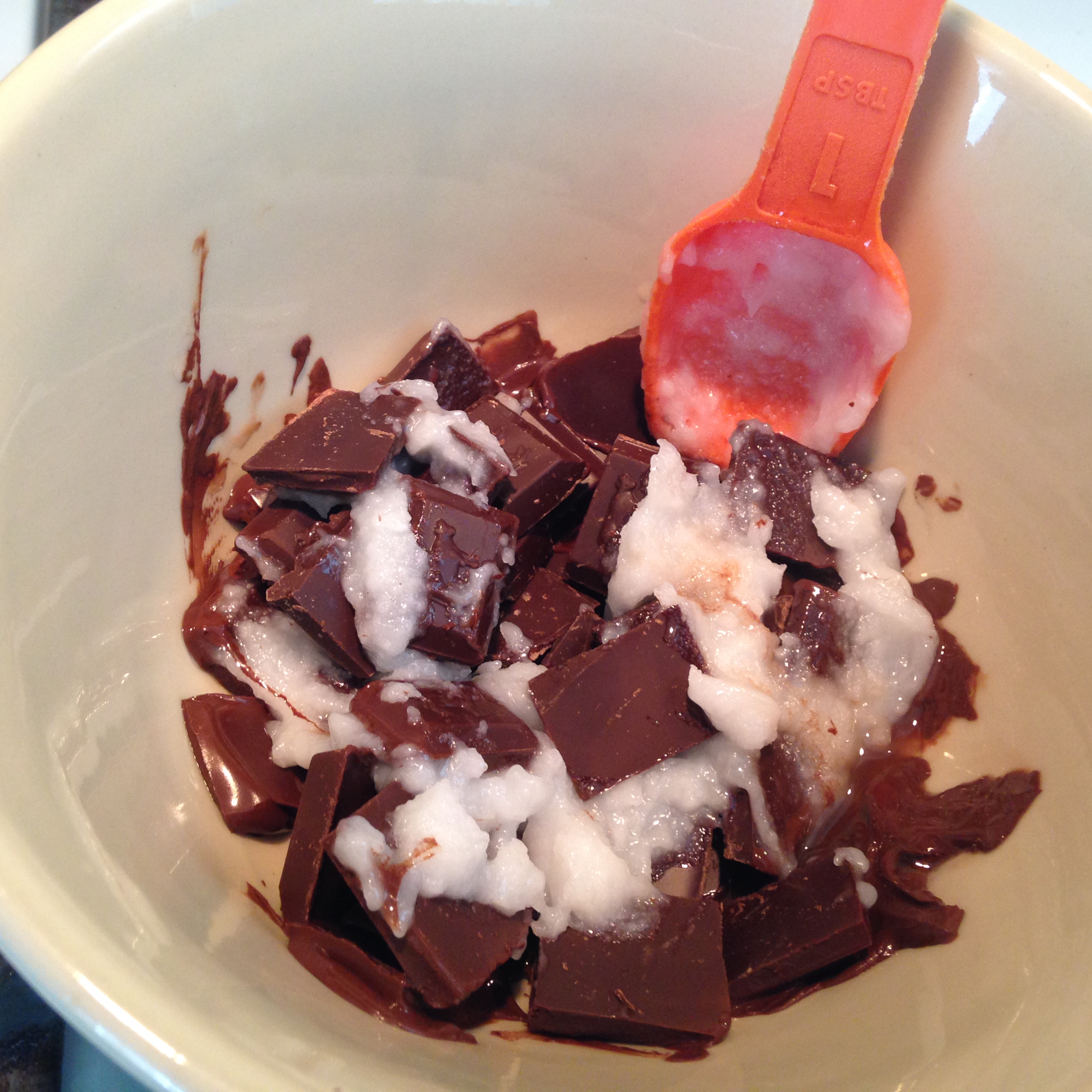 - In a double boiler* on medium heat, MELT the chocolate with 2 tablespoons of coconut oil. STIR occasionally until completely combined. TURN off heat but leave on the stove to stay warm.