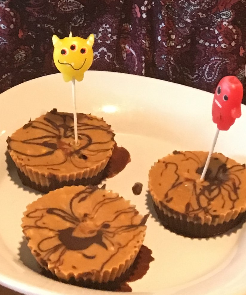 - Remove cups from freezer and DROP a small spoonful of peanut butter/coconut oil mixture on top of the hardened chocolate/coconut mixture in each cup. FLATTENING with the back of a spoon.